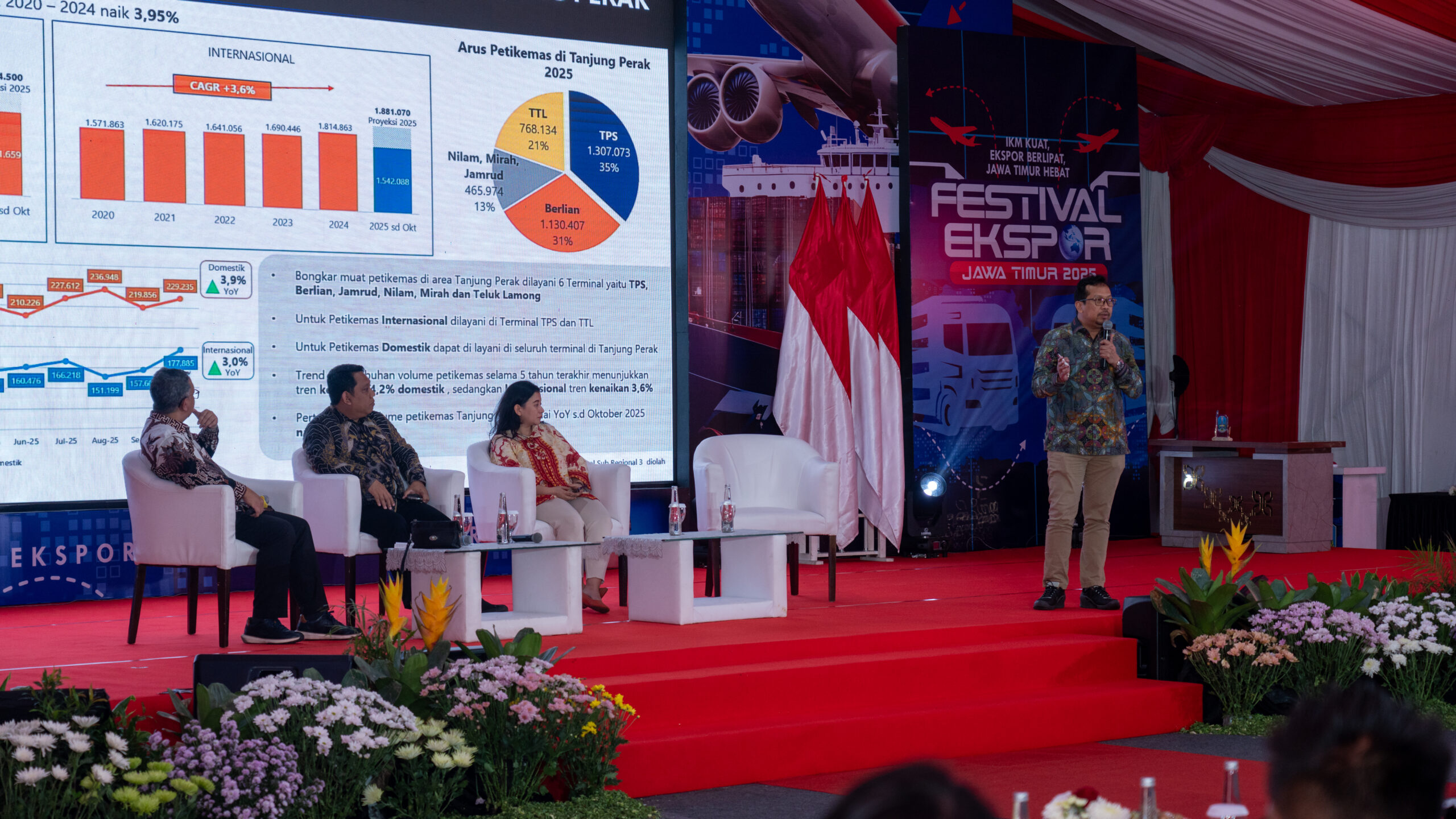 “TPS berkomitmen menjadi mitra dalam mendorong peningkatan ekspor Jawa Timur. Dengan dukungan alat, fasilitas dan sumber daya yang kuat serta berpengalaman, TPS siap untuk terus mendukung penguatan pertumbuhan perdagangan internasional,” demikian disampaikan oleh Direktur Utama TPS, Wahyu Widodo, saat menutup penyampaian sharing tentang TPS yang disampaikan dalam Seminar “Melihat Potensi Ekspor dan Pertumbuhan Ekonomi Tahun 2026”, sebagai salah satu narasumber, bersama narasumber dari Lembaga Pembiayaan Ekspor Indonesia Wilayah III, Dessy Dania, dan Direktorat Jenderal Pengembangan Ekspor Nasional Kementerian Perdagangan, Dwinanto Rumpoko.