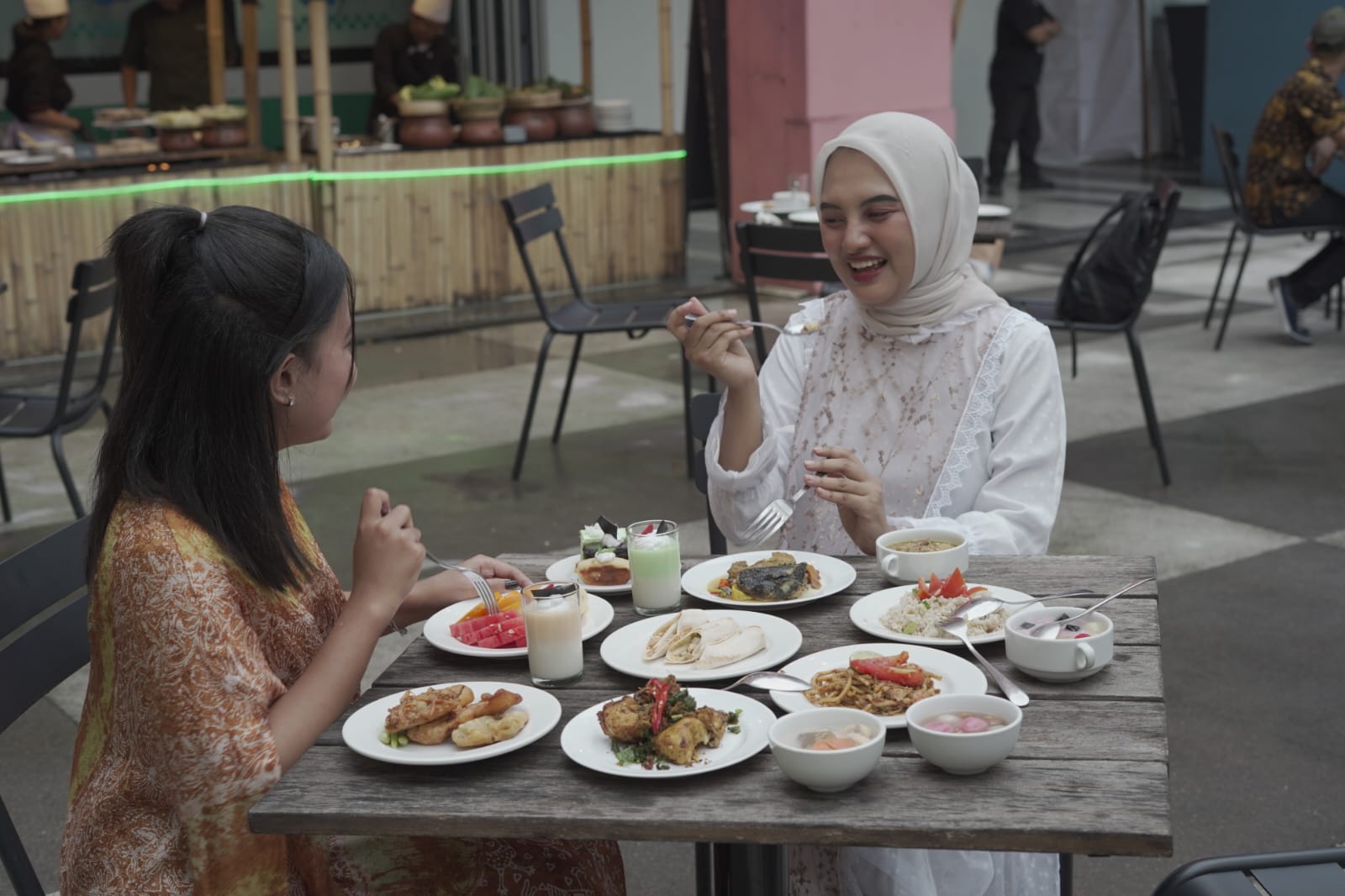 Suasana berbuka semakin meriah dengan kehadiran live cooking station yang menghadirkan pengalaman interaktif, di mana para tamu dapat melihat langsung proses pengolahan hidangan favorit mereka secara fresh dan menggugah selera.